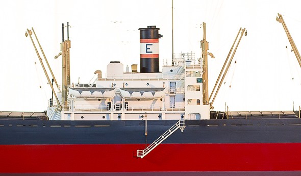The Maritime Commission designed the Victory ships with an eye toward their post-war careers; as the Commission sold them to commercial operators throughout the late 1940s, Victory ships became the backbone of many U.S. shipping companies’ post-war merchant fleets. This model details a Victory ship after its conversion to its post-war commercial configuration; the gun tubs that were on the forecastle and on the deckhouse near the stern have been removed and the ship is painted with the American Export Lines livery .